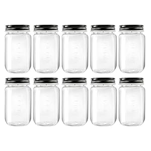 1. Noveinks 16 OZ CLEAR PLASTIC JAR : The package includes 10 pack 16 oz clear plastic jars with black metal lids. PLASTIC Jar Product measures 2.8 Inches Diameter, 5.3 Inches Height. Designed with a unique liner to maintain freshness longer than other containers, they are durable and refillable.