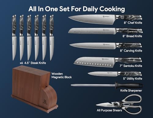 Perfect Kitchenware Gift Idea: This set of German knives combines high-end materials and first-class craftsmanship. With the blade’s distinctive Damascus pattern, the handle’s elegant cloud effect (made of ABS), and the power of the knife holder, it is a unique gift for family and friends on birthdays, weddings, and housewarming parties.