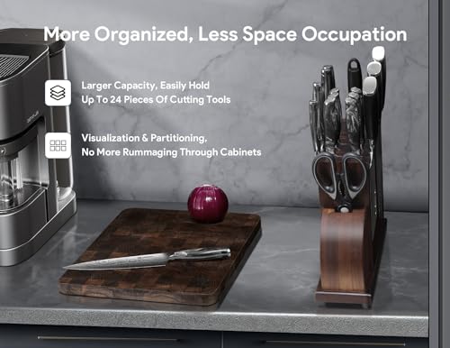 Space-Saving Design Of Magnet Knife Block: The double-sided magnetic design can easily hold up to 24 pieces of cutting tools, keeping your kitchen countertop clean and organized. The knife holder helps you secure your knives vertically without pushing them into a wooden, hard plastic, or metal block, which helps reduce scratches on the blade and damage to the edge.