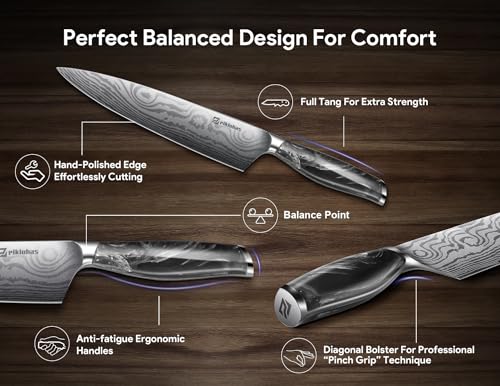 Enduring & Excellence Sharpness: Professional, the satin-finished blade has precision cutting and is finely honed. Each knife’s edge of Piklohas is hand-polished and precisely achieves 15 degrees per side for maximum sharpness, with Rockwell hardness of 58, extraordinary properties, and edge retention.