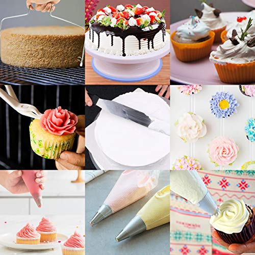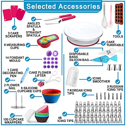 COMPLETE CAKE DECORATINGSUPPLIES:Including everything you need to begin decorating Cakes: 11 Inch Turntable stand, 48 Numbered Icing tips with Pattern Chart & E.Book,3 Russian tips, 7 Korean tips, 1 Straight & Angled Spatula, 1 Cake Leveler, 3 Cake Scrapers, 4 Icing Couplers,1 Silicon bag,100 Disposable bags, 1 Lifter, 2 flower nails, 1 Icing Smoother,2 Pastry Bag Ties, 1 Pen, 1 chocolate mould, 1 Egg Beater, 1 Silicone Spatula, 14 Fondant tools, 6 silicone cupcake cups, 100 Cupcake wrappers.