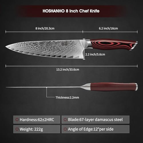 【Great Choice to Kitchen】Utility knife blade is 8 inch long, 2.2mm thickness, knife weight is 222g. It is ideal for your daily cooking and suitable for preparing all types of cuisine—from East to West. HOSHANHO chef knife will be packed in a beautiful gift box, making this knife a perfect gift for yourself and others.