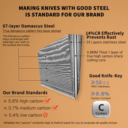 【True high-carbon cutting core of Damascus steel】ZongChuan 8C Pro Damascus chef knife Set only uses a true high-carbon cutting core with a carbon content of ≥0.8%, meeting professional standard configurations. The knives are crafted from high carbon stainless steel with precise control over heat treatment temperature and time, ensuring exceptional durability, edge retention, and rust resistance. The Damascus steel blade not only presents a stunning aesthetic but also delivers outstanding sharpness and precision, making it the essential choice.