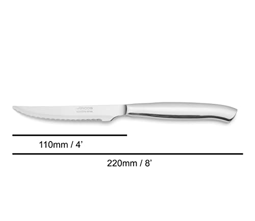 The Arcos four-piece steak knife set from the Mesa series includes 4 monoblock pieces made of stainless steel. The serrated edges make them perfect for cutting and chopping roasted meats, chops or steaks. Manufactured in a single piece, they are characterized by the elegance of their shapes and their durable, resistant and ergonomic structure.