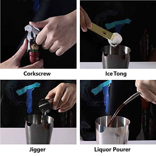 Professional Bartender Set: Our 8Pcs bartending kit includes a 20oz cocktail shaker, Hawthorne strainer, 2/3oz and 4/3oz double side jigger, corkscrew, ice tongs, mixing spoon, liquor pourer and bamboo stand. Have all the tools you need to effortlessly mix and create your favorite cocktails. Whether you enjoy classic cocktails or innovative mixes, this cocktail set provides the essential tools to turn your creativity into reality.