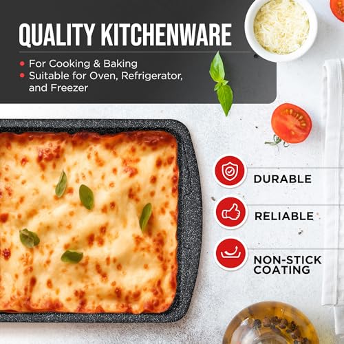 VERSATILE AND SAFE – suitable for use in the oven, refrigerator, and freezer, our bakeware pan set is PFOA, PFOS, and PTFE-free, ensuring the health and safety of your family. It’s dishwasher safe for convenience but we recommend hand-washing to maintain the long-lasting, stain-resistant properties of each of our baking set gift items