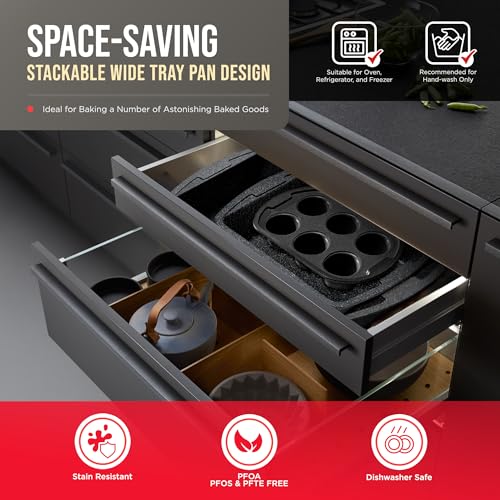 SPACE-SAVING DESIGN – the stackable wide tray pan design of each piece from our bakeware set not only saves precious cabinet space but keeps your kitchen organized and ready for your next baking session. Our baking set pans are a stylish and attractive addition to any kitchen