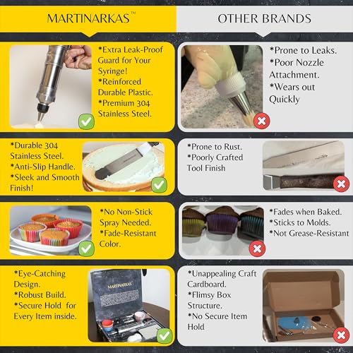 YOUR BAKING SUPPLIES SET: The pastry syringe has a unique protector to prevent cream leakage. Simple assembly and includes 2 brushes for efficient, thorough cleaning. Cupcake liners have a non-stick coating, are in perfect shape when baking, and are easy to release. Durable, without discoloration or holes, for flawless baking.