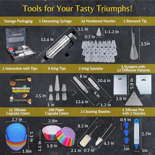 MULTIFUNCTIONAL PREMIUM SET: Your cake decorating tools consist of 159 pieces, including 1 Stainless Steel Frosting Gun, 2 Stainless Steel Spatulas, 3 Cake Scrapers Smoother with 12 Patterned Sides, 24 Numbered Frosting Piping Kit – 0.7 inch, 6 Frosting Tips – 1 inch, 1 Cupcake Injector, 100 Rainbow Paper Forms for Baking Cupcakes, 15 Colorful Silicone Cupcake Liners with Non-Stick Surface for Baking, 2 Cleaning Brushes (small/large), 1 Silicone Pen with 4 Nozzles, 1 Instruction Manual.