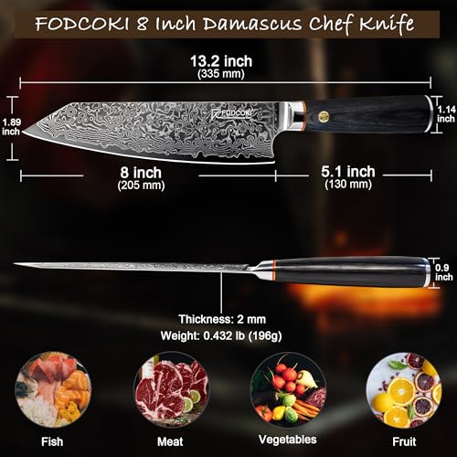DAMASCUS SUPER STEEL: Integrating the high-edge forging knife craft of Japan and Germany, FODCOKI 8″ chef knife made of Damascus stainless steel with ultra sharp cutting core VG-10, a premium material used in high-end kitchen knives. Forging 67 layers with high carbon steel and vg10 into a single piece, that the 8 inch Damascus steel knife combines various metal best characteristics