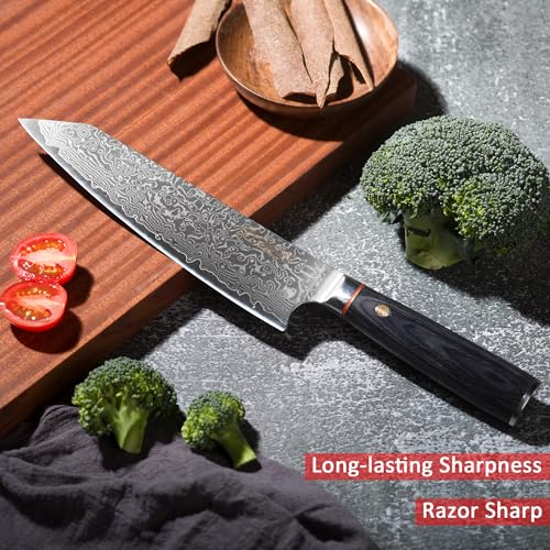 PERFECT BALANCE & LIGHTWEIGHT DESIGN: The combination of Damascus steel and black solid wood creates this luxurious and well balance kitchen knife. The 8 in master knife can be used with left or right hand, and the lightweight design is especially suitable for women. You can easily handle kitchen foods of cutting, chopping, slicing and dicing, like sushi, fruits, vegetables, meat, fish, chicken, and beef etc
