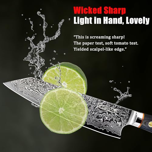NATURAL PATTERN & GIFT PACKAGING: Each Japanese chef knife is forged 67 times to form a natural unique texture, finally is polished and the angle of blade edge sharpened to 13-15 ° by craftsmen to make the Asian Gyuto knife have razor sharp performance. Packed in exquisite box, FODCOKI Damascus cooking knife is a best selected gift for families and friends