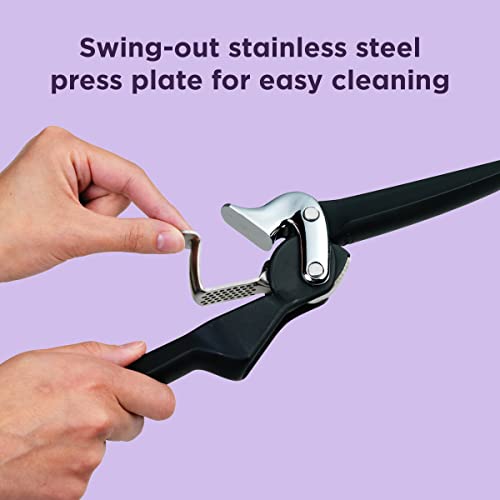 IMPROVED DESIGN: The swing-out stainless steel plate makes pushing out excess garlic and skins quick and easy