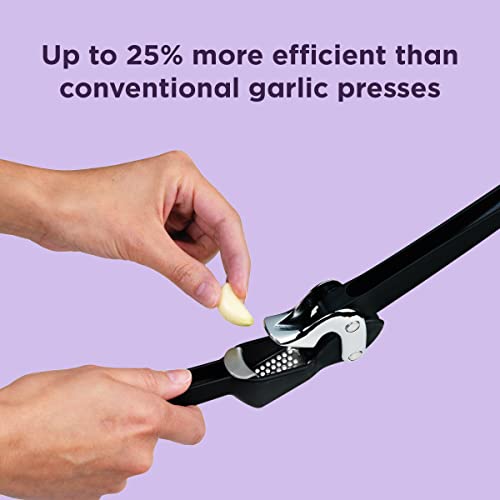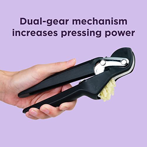 PERFECT TOOL FOR THE JOB: Now you can have fresh pressed garlic at your fingertips in seconds! This dual-gear garlic press features mechanism that provides 25% more pressing power than standard garlic presses