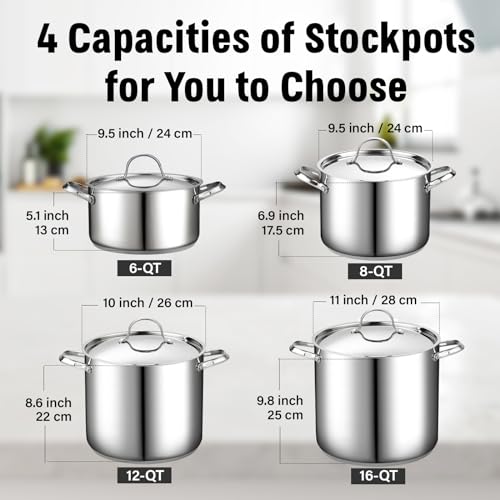 【18/10 Stainless Steel】 8-Quart stockpot stainless steel, made with polished 18/10 stainless steel with an aluminum disc layered in the bottom.