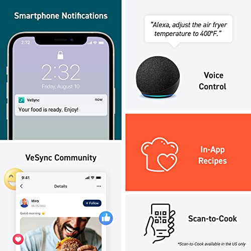 Scan-to-Cook: Use the free VeSync app to scan multiple types of frozen foods for easy-to-follow cooking instructions and to view your food’s nutrition facts