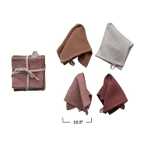 This set of four dish cloths in Loops, Cream, Berry, Terra-cotta, and Putty color combines functionality and style, featuring a textured waffle weave and convenient loops for easy hanging and storage