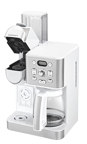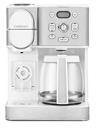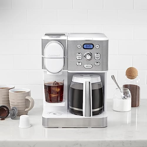 Drip or pod, hot or iced, single cup or carafe for 12—get your coffee, your way with the Cuisinart 2-in-1 Coffeemaker. This kitchen essential for coffee lovers takes home brewing to another level by combining 12-cup carafe and single-serve options in one convenient unit. Brew a full pot 25% faster with Extreme Brew technology. Customize when and how you want your coffee with advanced start, Brew Pause™, temperature control, auto-off, and bold flavor settings. Instantly brew a single serving of hot coffee in 5 cup sizes with any pod, including Keurig K-Cup®, or the reusable HomeBarista™ filter. Or brew over ice for delicious coffee that refreshes! Experience complete brewing versatility and customizable convenience, courtesy of Cuisinart!