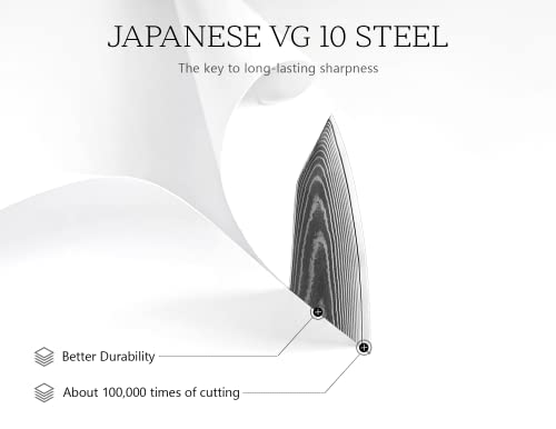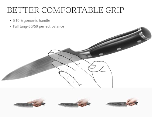 Secure Grip: Japanese chef knife features a G-10 military-grade handle, a full tang, dual steel head, and triple-riveted stability structure. It is designed to perfectly conform to any hand shape, following the golden ratio balance, ensuring fatigue-free use over extended periods.