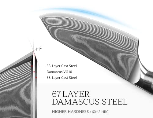 Craftsman’s Artistry: Damascus chef knife features authentic Japanese Damascus steel with a unique pattern, a VG10 steel core, and undergoes multiple folds and forging processes at 1050°C, followed by nitrogen cooling. This process results in a hardness of 60 HRC ±2 HRC, crafting a 67-layer blade that is both highly corrosion-resistant and exceptionally sharp.