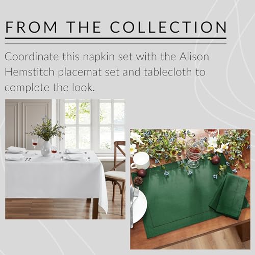 The Alison eyelet punched Border Napkin Set features a luxurious texture and a timeless heirloom charm that is sure to add a touch of elegance to your dining table. Available in a captivating array of solid colors with a delicate eyelet punched openwork border and embroidered look, the Alison eyelet punched table linens create a timeless appeal that complements a wide variety of décor styles from modern to traditional. Whether you’re hosting an intimate family gathering or a holiday dinner party, these versatile dinner napkins effortlessly elevate the atmosphere. Napkins are sold as a set of four, each measuring 17 inches by 17 inches. 100% Polyester. Easy care, machine washable, and dryer safe for effortless upkeep. Designed to coordinate beautifully with various styles of dinnerware. For a complete look, pair your napkins with our matching Alison eyelet punched tablecloth and placemats.