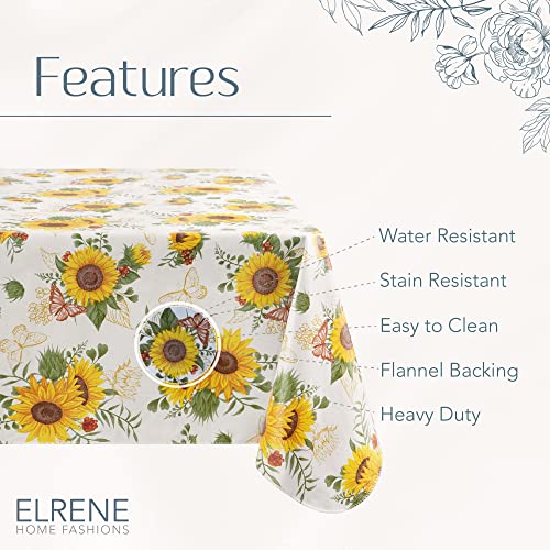 For over 100 years, Elrene Home Fashions has been trusted to provide quality home decor to suit every style, from modern to traditional and everywhere in between. The Sunflower Season printed vinyl tablecloth features a vintage artwork of yellow sunflowers surrounded by rust and gold monarch butterflies over a white ground. Excellent for special occasions, events, dinners, parties, picnics, barbeques, and everyday use, this PVC tablecloth has a polyester flannel backing that holds it in place and adds extra durability.