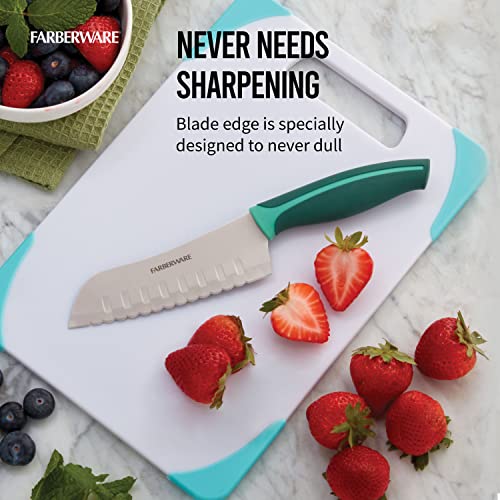 Always have the right knife on hand with this Farberware 5 inch Serrated Santoku Knife. The unique design of the blade delivers a superior slicing experience. The Serrated Santoku Knife combines the utility of a serrated bread knife with the versatility of a Santoku blade, making it totally unique. The knife features kullens designed so food never sticks to the blade. This knife effortlessly slices, chops, and dices through a variety of meats, fruits, and vegetables. The plastic handle has soft rubber accents that provide a secure, comfortable grip. Includes: 5 inch serrated santoku knife. Hand wash with warm water and a mild detergent then rinse and dry immediately. Stainless steel knives are not dishwasher safe.