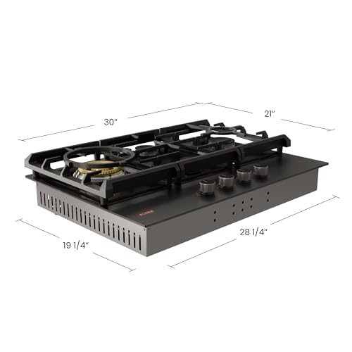 Versatile Tri-ring Burner – FOTILE GLG30401-Y culinary grade cooktop is excellent for cooking in versatile styles with a 18,000 BTUs high output tri-ring center burner for boiling, searing, pan frying and stir-frying, a 13,000 BTUs burner offering high heat, and two dedicated simmer burners with 6,000 and 3,000 BTUs delivering consistent and accurate low heat for delicate cuisines.
