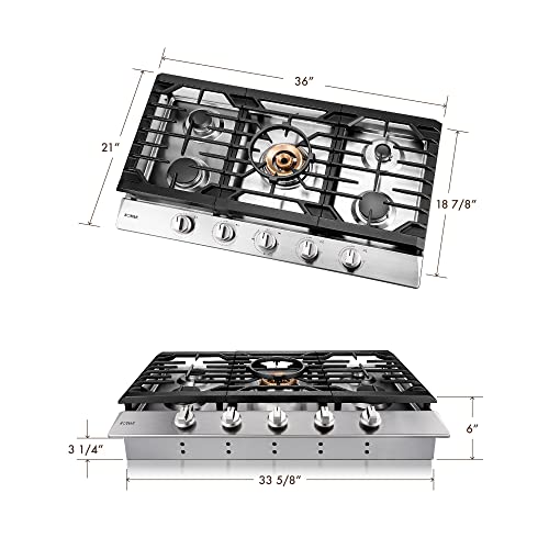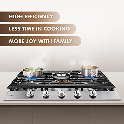 FOTILE GLS36502 36” Stainless Steel 5-Burner Gas Cooktop, Tri-Ring 22,000 BTUs Center Burner with Flame Failure Protection Removable Grates and Installation/LP Kit