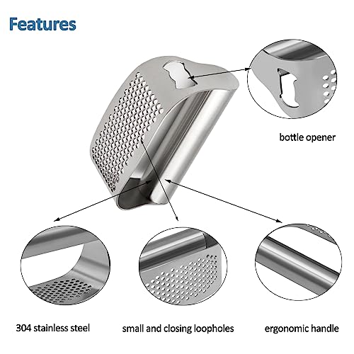 2-in-1 Versatility: Not only does it crush garlic, but it also functions as a bottle opener. Additionally, it comes with garlic peelers, serving as an excellent helper to remove the peel from garlic cloves effortlessly. Say goodbye to lingering garlic odor on your fingers.