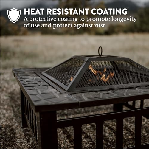 The 32-inch square fire pit is a dream come true for those who want to take their outdoor gatherings to a whole new level. This large fire pit has a timeless metal finish that seamlessly enhances various outdoor settings. Its sturdy design is made of metal to ensure stability, as well as portability. Crafted from heavy-duty metal, this outdoor fire pit table ensures longevity even in harsh outdoor conditions. The complete set includes the actual fire pit, as well as a protective cover, spark-controlling mesh lid, and fire poker.