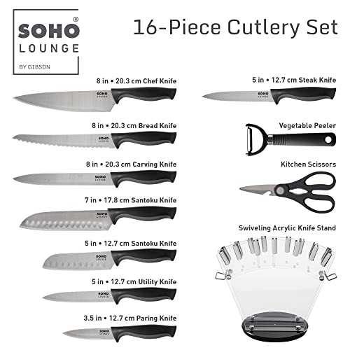 From the tabletop to the kitchen, Gibson’s best-selling Soho Lounge collection brings its signature, modern designs to a new cutlery set! The Soho Lounge 16-piece Cutlery Set with Acrylic Storage combines modern sensibilities with precision and functionality. Made from forged stainless steel, this set offers a complete assortment of kitchen tools to tackle daily food prep. Each knife features an ergonomic, soft-touch handle that provides a safe and comfortable grip. The acrylic storage module safely stores the utensils and gadgets when not in use. It has a 360-degree rotating base to provide easy access to the countertop. Handwash only.