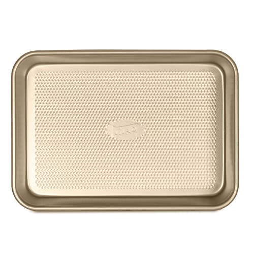 9X13 CAKE PAN BAKES EVENLY – This 1/4 sheet pan is designed with a raised diamond texture that increases airflow for even baking, and it provides fast heat distribution with its carbon steel build.