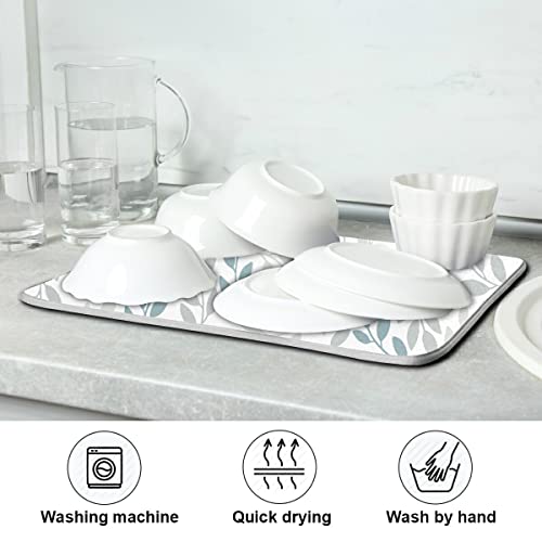 Grey and Blue Leaves branches Dish Drying Mat 18×24 for Kitchen Gray Leaves Botanical Spring Flowers Dishes Pad Dish Drainer Rack Mats Absorbent Fast Dry Kitchen Accessories