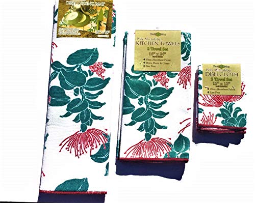 Hawaiian Linen set: Ohia Lehua design, includes : One dish drying mat, One set (2 pieces) Kitchen Towel 16×24″, One set (2 pieces) Dish Cloth 12×12″