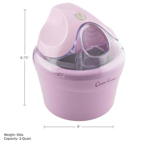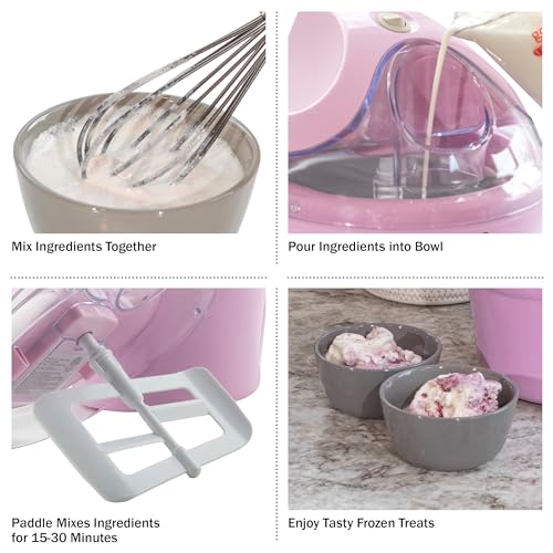 PRODUCT DETAILS – Materials: ABS, AS, PP, and Aluminum. Dimensions: (L) 8” x (W) 8” x (H) 8.75”. Weight: 6lbs. 1-Quart Capacity. ETL-Listed. Includes Paddle, Machine, Bowl, and Recipe Book. Color: Pink.