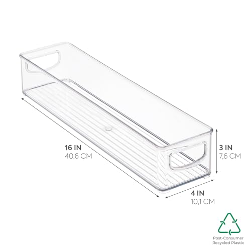 Upgrade your kitchen organization and storage with the iDesign Plastic Kitchen Storage and Fridge Organizer Bin. It’s a quick and easy addition to your pantry, cabinet, fridge, or freezer that will bring functional beauty and organized style. The versatile clear storage bin is ideal for use in the fridge and freezer to store produce, meat, cheese, drink boxes, food packets, potatoes, apples, onions, and more, or to store dry goods in the pantry and cabinet. Easily access or reorganize your items with the integrated handles on this fridge bin. The transparent design of the clear organizing bins ensures items are always visible and accessible. Measuring 16″ x 4″ x 3″, the food storage container is just the right size to store food in your fridge, freezer, pantry, or cabinet. Use several as clear storage bins to store kitchen utensils and tools, cleaning supplies, cosmetics, and crafts, or for extra organization in your closet or laundry room. Made with durable BPA-free clear plastic, this kitchen storage container stands up to everyday use. With iDesign, you can live simply and sustainably every day.