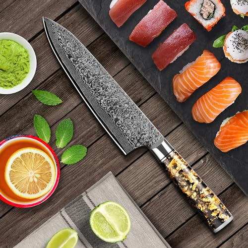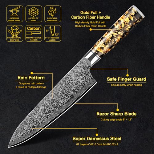 Japanese Damascus Steel Chef Knife – Gold Foil & Carbon Fiber Handle – Razor Sharp Blade – Kitchen Knife with Secure Finger Guard – Chef Knife for Professional Grade – Size 7.79 Inch