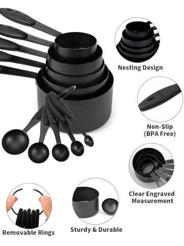 Joyhill Measuring Cups and Spoons Set of 10 Piece, Stainless Steel Measuring Cups with Soft Touch Silicone Handles, Nesting Metal Measuring Cups for Dry & Liquid Ingredients, Cooking & Baking (Black)