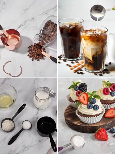 👍【High Quality】: Joyhill’s metal measuring cups and measuring spoons set is 100% made from food-grade extra thick stainless steel which is copper-plated, rust-resistant, non-toxic and odorless, in line with national food safety regulations, sturdy and durable. The smooth surface polishing process leaves no food or liquid residue and no breeding space for bacteria.