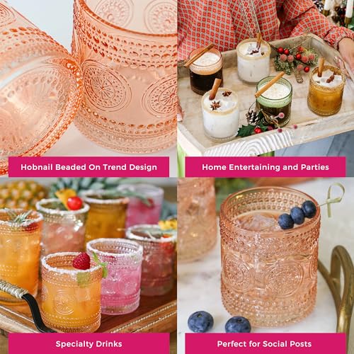 There is no better stage for rose gold than in glassware. That is displayed beautifully in our 10 oz Hobnail Beaded Floral Vintage Drinkware in Rose Gold. The Hobnail Beaded Floral design is timeless and reminds us how in the past, fine craftsmanship and intentional design were revered. We updated the design by using the beauty that is the color rose gold. The two together are a magical combination. The perfect size for a rocks glass or lowball glass to hold fine liquors like bourbon, whiskey, and rum which makes them the perfect gift for all your favorite connoisseurs in your life. Pink is not just for girls and the way the gold elevates a cocktail is for everyone! Whether you are trying to update your drinkware at a luxury hotel or fine restaurant or you’re just trying to make your new gold bar cart really shine, the proof is in the glass. We use the highest quality materials to make sure that you will be able to use them day after day and celebration after celebration. Whether you are having a Friday night bourbon to loosen up after a long week or you are planning a Thanksgiving day for 25 these elegant vintage drinking glasses light up your drinks from water to cocktails. The versatility is endless and the color is divine; to ensure that these beauties arrive to you safe and sound we have intentionally packed each glass surrounded with bubble wrap and encased with the highest quality materials and design to make sure from showroom to doorstep they remain perfect. Purchase these amazing Rose Gold Drinking Glasses or one of our other many colors for you and your friends.Features and Facts: