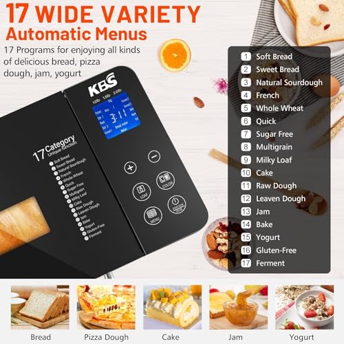 KBS 17-in-1 Bread Maker-Dual Heaters, 710W Machine Stainless Steel with Gluten-Free, Dough Maker,Jam,Yogurt PROG, Auto Nut Dispenser,Ceramic Pan& Touch Panel, 3 Loaf Sizes 3 Crust Colors,Recipes