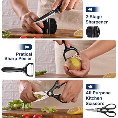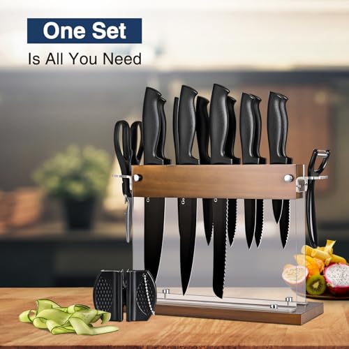 Kitchen Knife Set with Block 15 pcs, Black Knife Set with Block and Sharpener, Sharp Knife Block Set with Wood Acrylic Stand, Stainless Steel Knives set for Kitchen Cooking