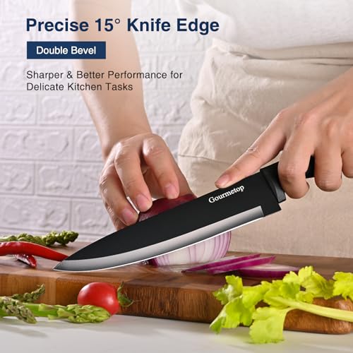 Ultra-Sharp Double-bevel 15° Knife Edge for Impressive Sharpness: Gourmetop precisely sharpened and honed its knives edge at 15°, believing that this knife blade angle is finer to make a more accurate cutting experience. With an exceptionally sharp edge, our kitchen knives offers a smooth and effortless cut, which easily slide through meats, veggies and fruits.