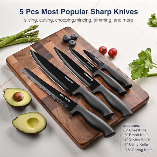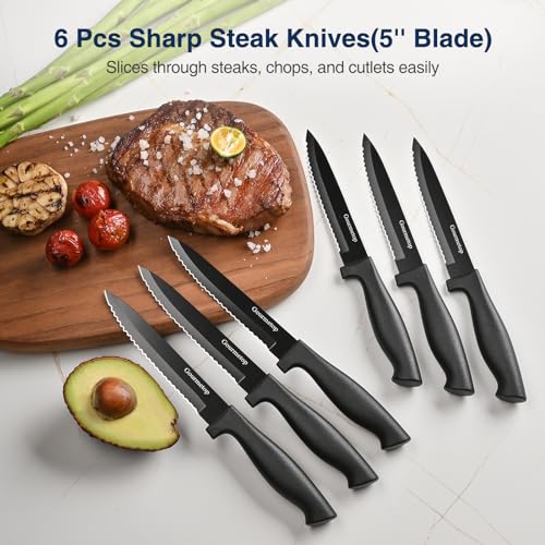 Kitchen Essential Knife Set: This Gourmetop 15-piece knife set includes all the essential knives needed to perform everyday food prep tasks such as slicing, cutting, chopping, mincing, trimming, and more. This knife set includes 6 pcs sharp steak knives, 5 pcs most popular sharp chef knives, 1 pcs kitchen scissors, 1 pcs knife sharpener, 1 pcs peeler and 1 pcs wood acrylic knife block.