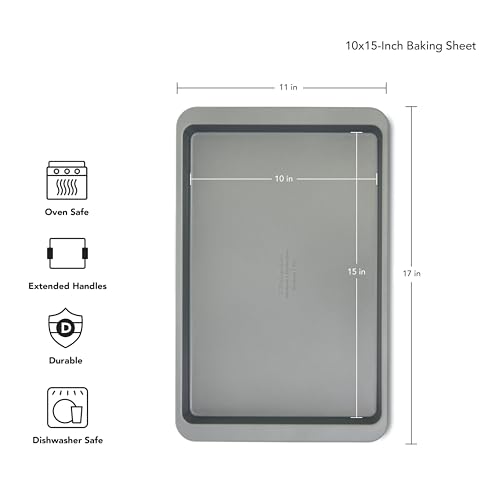 The KitchenAid 10×15-inch Baking Sheet is perfect for making cookies, jelly rolls, sheet cakes, or one-pan meals. Highly durable, this nonstick, oven-safe, heavy-duty aluminized steel pan stands up to high heat for all your baking needs and features a uniquely designed rim to prevent warping. It evenly distributes heat for consistent baking results and has extended handles that provide a secure grip for easy transport. Dishwasher safe.