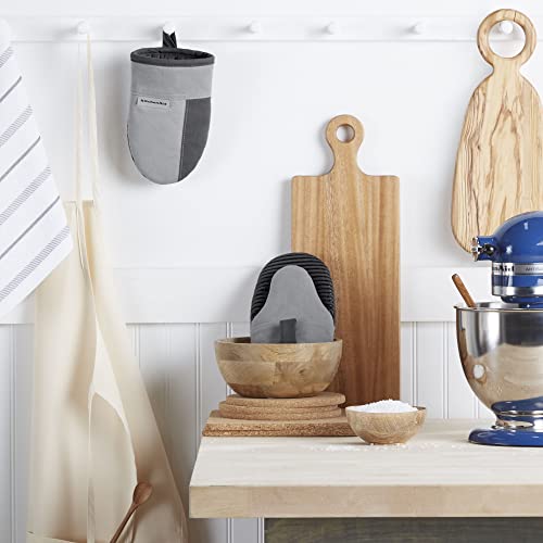Shield your hands from the heat and burns with the KitchenAid Beacon 2-Piece Mini Oven Mitt Set. Made of heavy-duty cotton with polyester lining that offers comfort and insulation. This set includes two mini oven mitts that each measure 5.5 inches wide by 8 inches long for easy on and off use. These mitts are heat resistant with clear printed silicone to ensure a more firm and secure grip. Featuring a convenient hanging loop for display or easy storage.