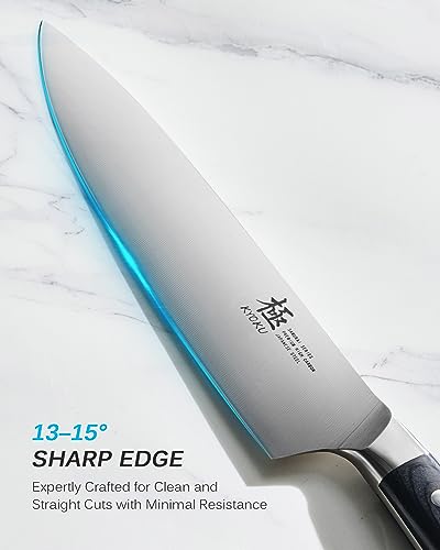 8″ Chef’s Knife: Kyoku’s 8″ chef knife from Samurai Series is expertly crafted with Japanese high carbon steel for superior performance and durability. With its ultra sharp blade, this knife is ideal for mincing, chopping, cutting, and slicing.