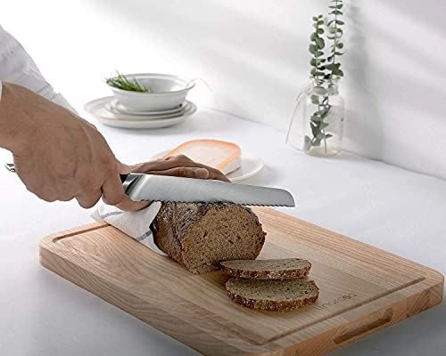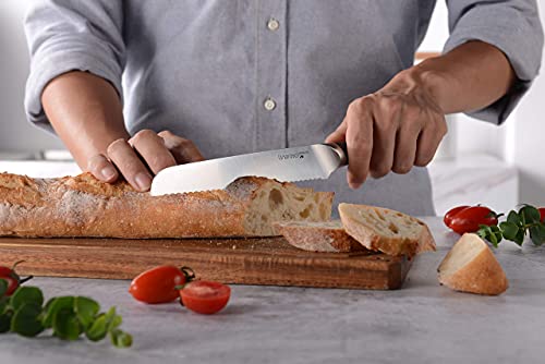 ✔【Modern, Innovative Design】With its modern, stunning handle design, this 8” bread knife is perfect for making scalloped edge cuts through a harder crust or peel without squashing tender interiors. More than just mere esthetics, the ergonomic handle shape is engineered for superior control, agility and comfort. Full tang that runs the entire length of the handle for superior balance.