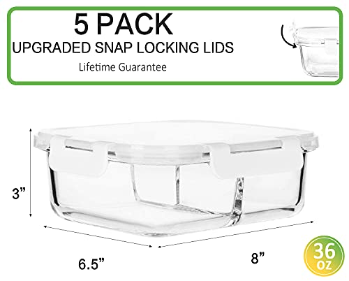 M MCIRCO [5-Pack,36 oz] Glass Bento Box 3 Compartment with Lids, Food Meal Prep Lunch Containers, BPA-Free, Microwave, Oven, Freezer, Dishwasher (4.5 Cups, White)